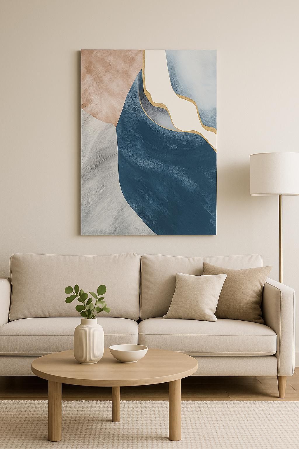 A modern abstract piece with deep navy, blush, gray, and ivory tones accented by golden streaks. Perfect for adding a touch of elegance and calm to your living room, bedroom, or office décor.