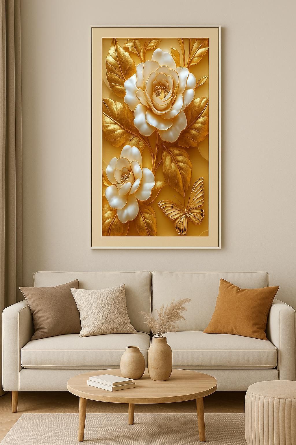 A luxurious floral wall art showcasing golden leaves, pearl-white blossoms, and a delicate butterfly. Perfect for elevating your home décor with elegance and charm.