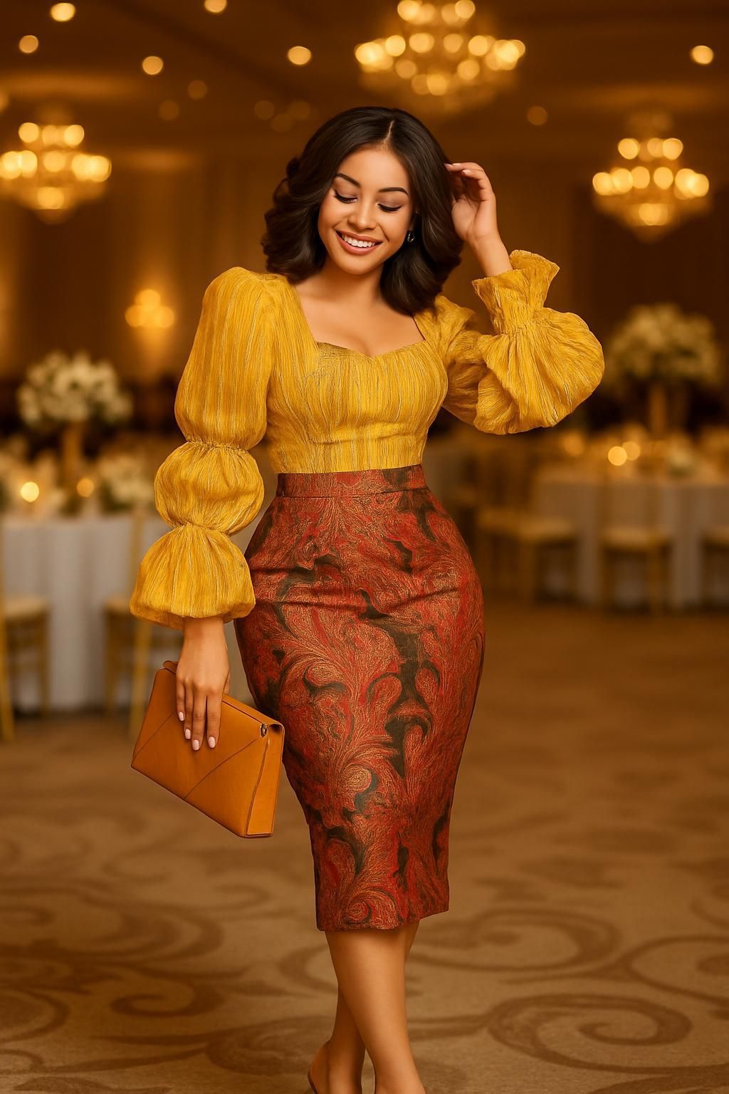 A golden puff-sleeve blouse paired with a bold jacquard pencil skirt. Perfect for weddings, formal dinners, and special occasions where style meets sophistication.